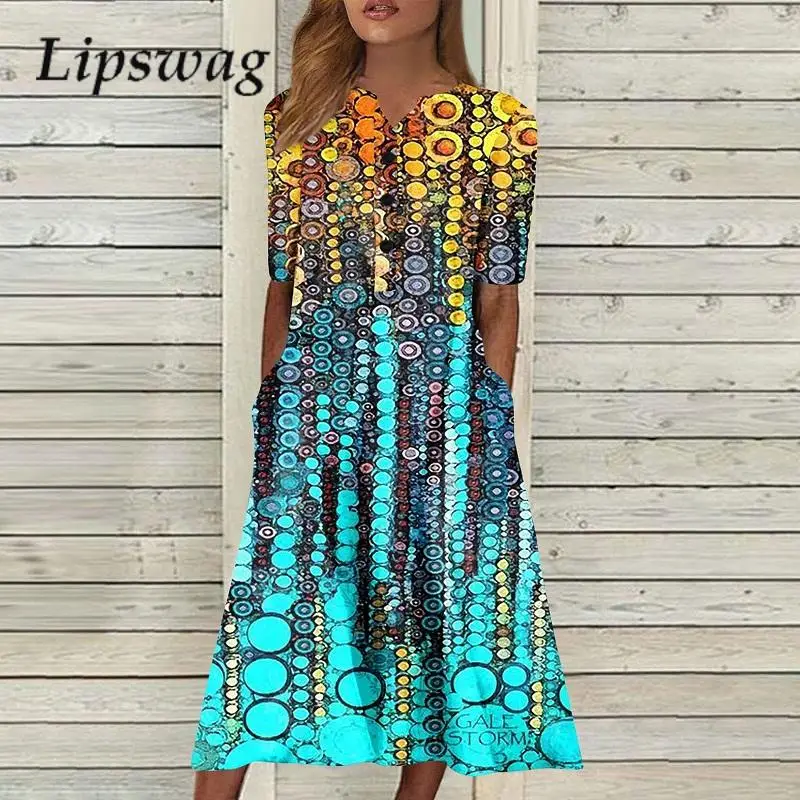 Fashion Pattern Print Party Dress Women Elegant V Neck Buttoned Long Dress Office Lady Summer Vintage Short Sleeve Maxi Dresses