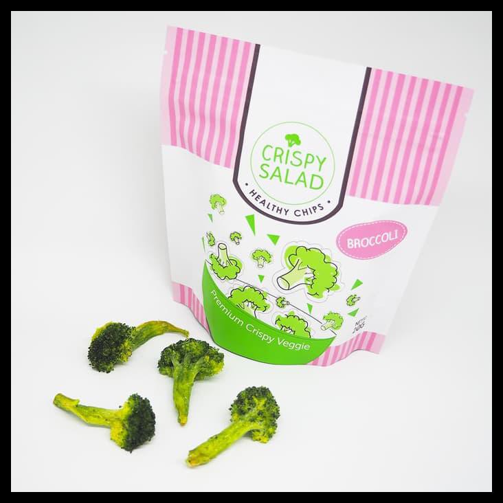 Crispy Salad Broccoli chips tersedia dalam rasa asli brokoli dan dilengkapi dengan garam pink himalaya murni dan cabe bubuk murni secara terpisah yang dapat ditambahkan sesuai selera.