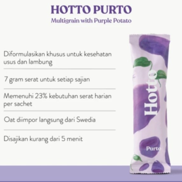 HOTTO Purto adalah minuman multigrain kaya nutrisi tapi rendah kalori. Membantu menurunkan kadar kolesterol dan kadar gula darah. Melancarkan pencernaan dan mengontrol nafsu makan.