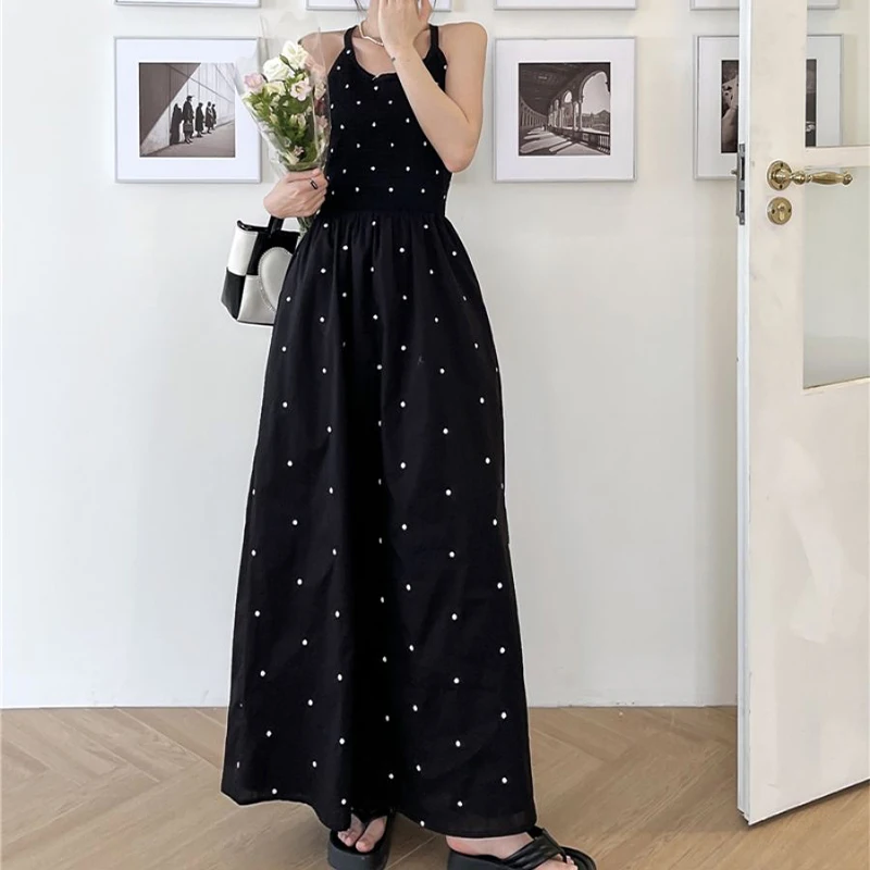 HOUZHOU Черное женское длинное платье в горошек на шнуровке с открытой спиной сексуальные винтажные Макси-платья для отпуска в пляжном стиле