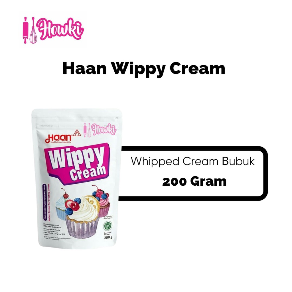 Haan wippy cream adalah whipping cream bubuk yang biasa digunakan untuk menambah rasa pada minuman / kue, bisa juga untuk ditambahkan sebagai bahan dalam pembuatan buttercream agar rasa lebih enak, atau bahan campuran es cream, cara pemakaian cukup campur merata bubuk whippy cream dengan air es (perbandingan 1 : 2) lalu mixer sampai kaku kurleb 3-4 menit, siap dipakai.