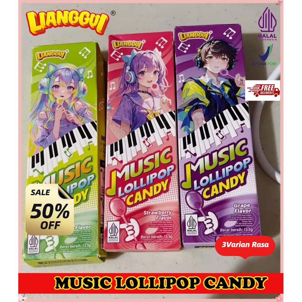 Halal Lianggui - Permen Lolipop Musik 3 Rasa Apel Stroberi Anggur Halal Cemilan Viral Anak Kantor Murah-Hadiah anak