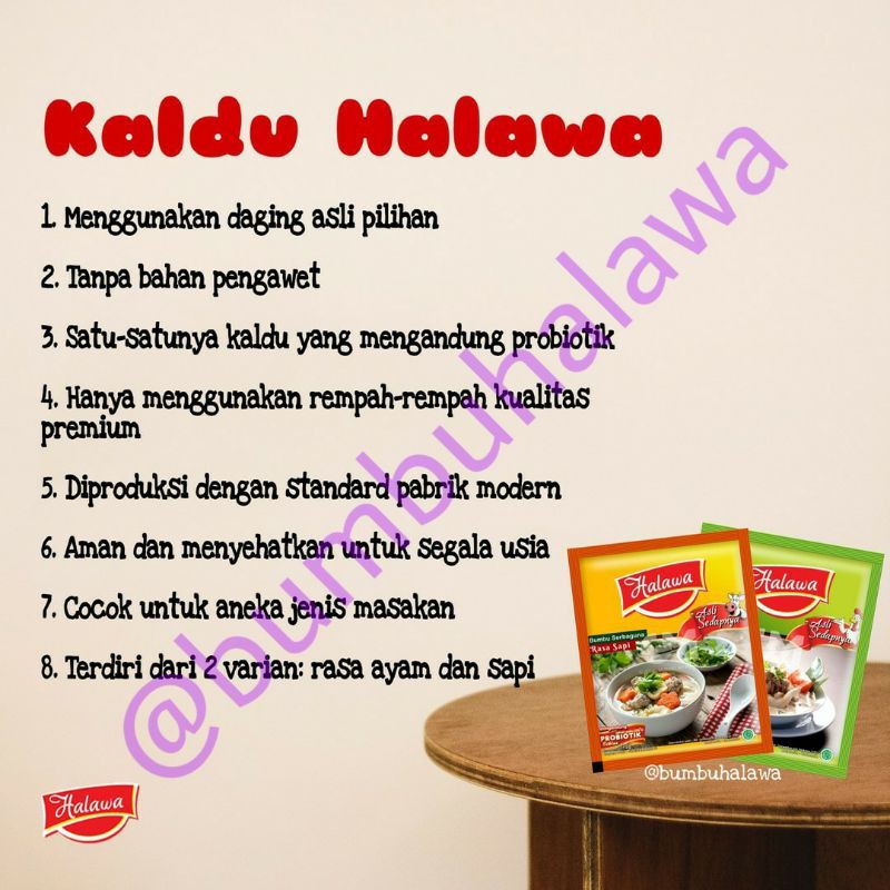 Halawa terbuat dari daging asli (bukan perasa daging) yang berkualitas premium dan rempah² terbaik. Diperkaya dengan probiotik yang sangat bermanfaat bagi tubuh. Diantaranya, untuk pencernaan, kecerdasan otak, meningkatkan penyerapa nutrisi, menetralisir zat² berbahaya bagi tubuh.