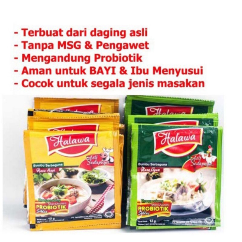 Halawa kaldu bubuk probiotik merupakan pengganti penyedap rasa MSG konvensional. Kaldu sehat Halawa hadir dengan 2 varian rasa yakni rasa ayam dan rasa sapi.