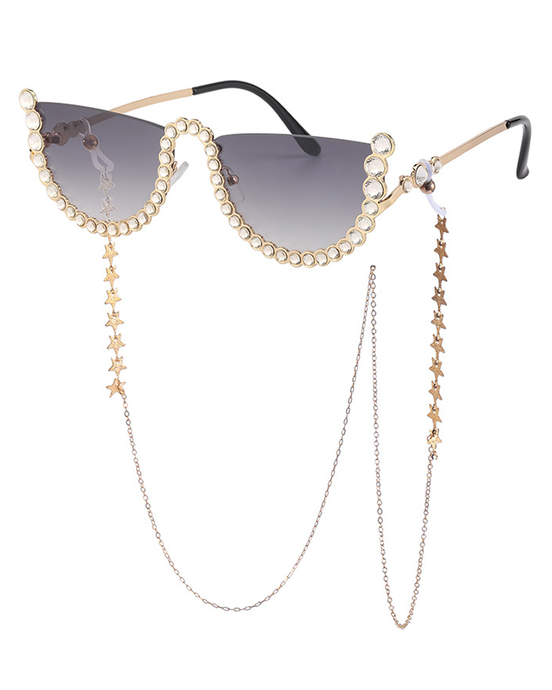 Half Rhinestone Frame Tinted Lens Flat Top Sunglasses With Chain, Gray
