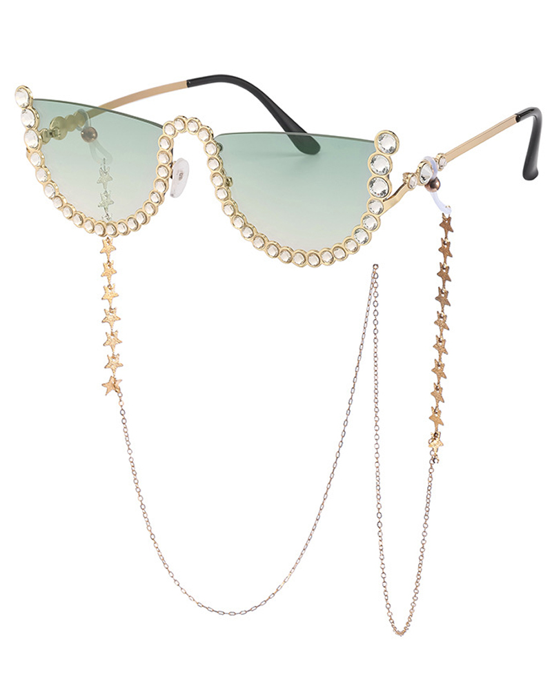 Half Rhinestone Frame Tinted Lens Flat Top Sunglasses With Chain, Green