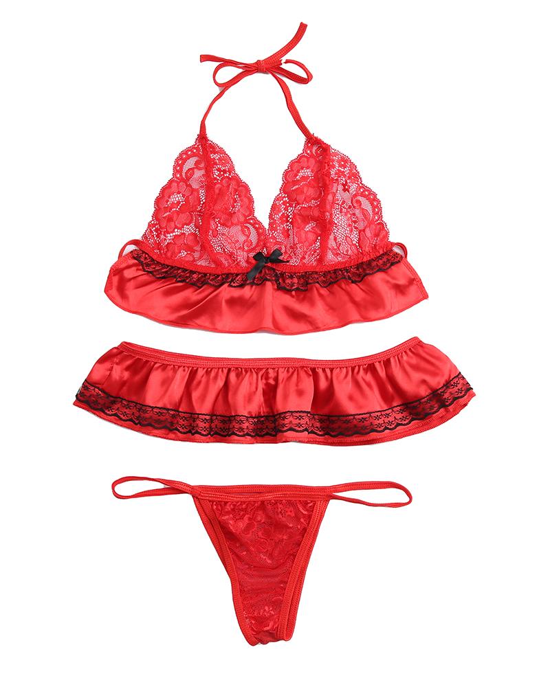 Halter Backless Ruffle Hem Contrast Lace Lingerie Set, Red
