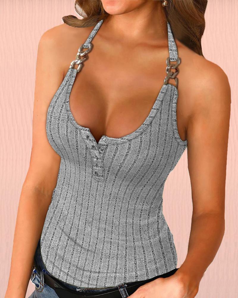Halter Buttoned Chain Decor Ribbed Tank Top, Gray
