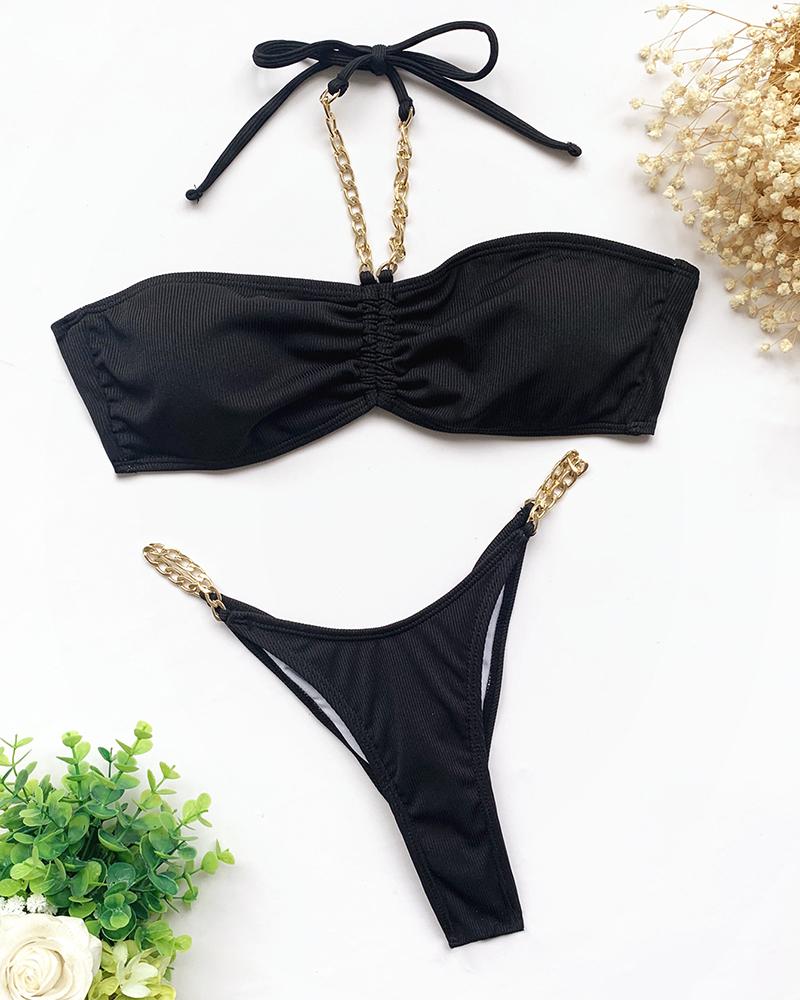 Halter Chain Strap Ruched Drawstring Bikini Set, Black