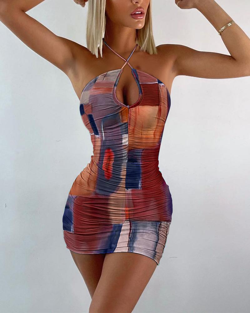 Halter Cutout Front Abstract Ruched Bodycon Dress, Multicolor