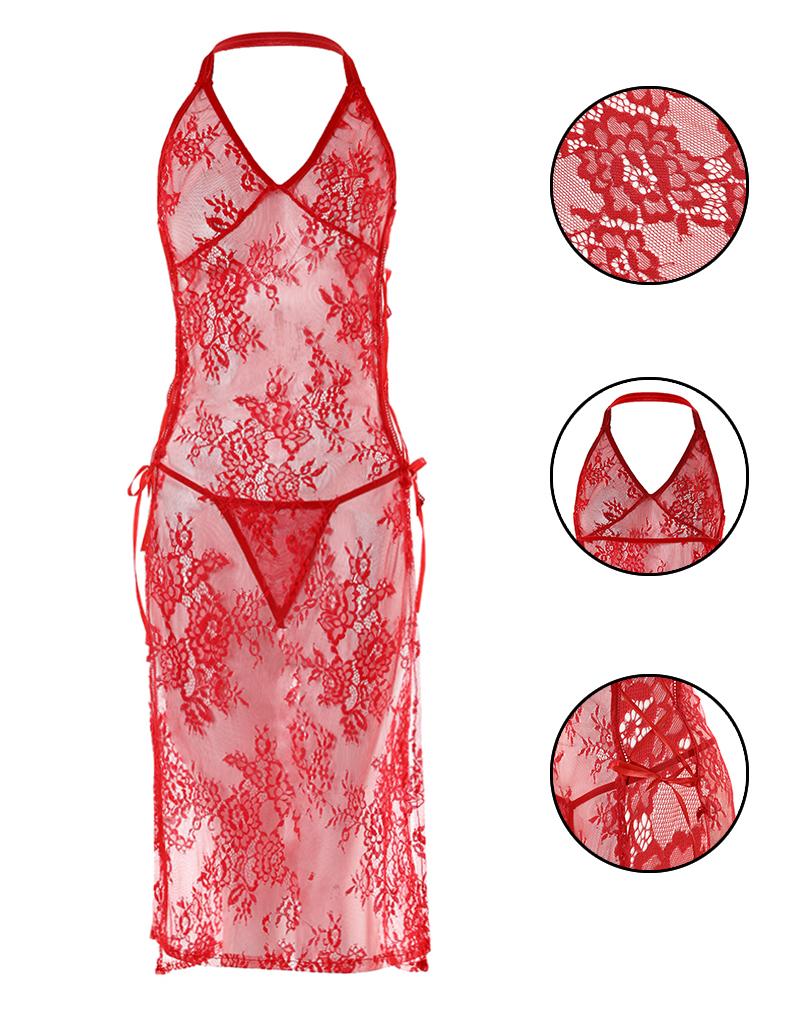 Halter Floral Embroidery Backless Lingerie Costumes, Red