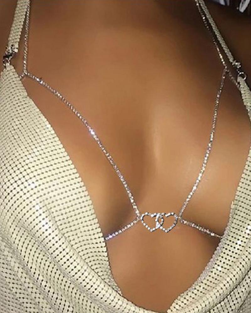 Halter Rhinestone Heart Pattern Bra Body Chain, Silver