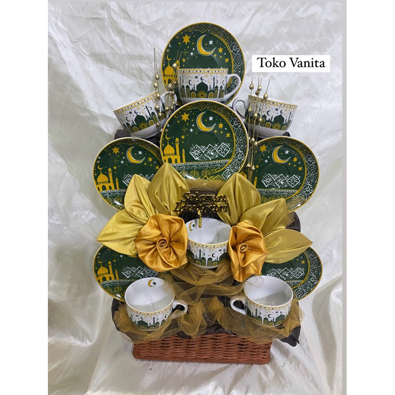 - Parcel set keramik , isi 6pcs cangkir motif lebaran dan 6pcs piring tatak motif lebaran dengan hiasan parcel tema lebaran