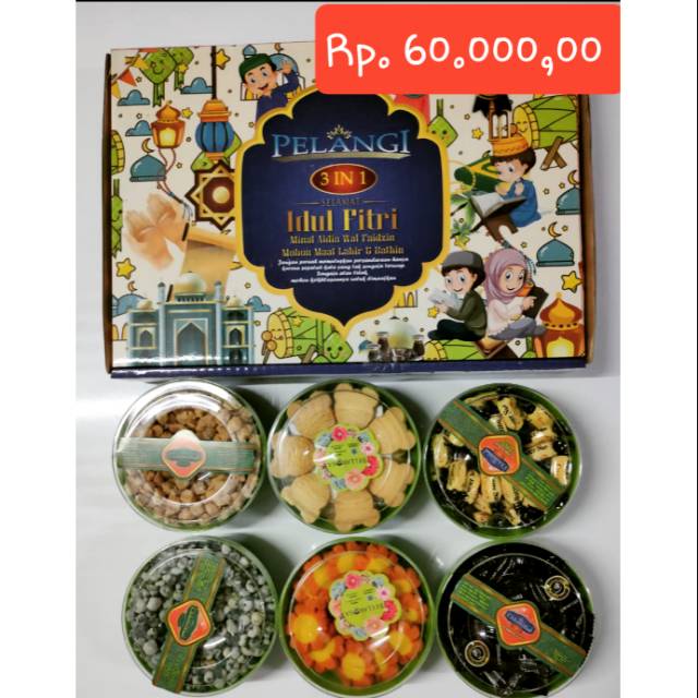 Pelangi 3 in 1 harga Rp 60.000. isi 2 kacang (kacang telor dan kapri), 2 kue kering dan 2 permen. Semua toples masuk di dalam dus.