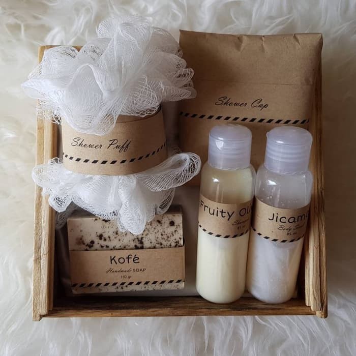1 shower cap1 shower puff1 body lotion1 body scrub1 artisan soap