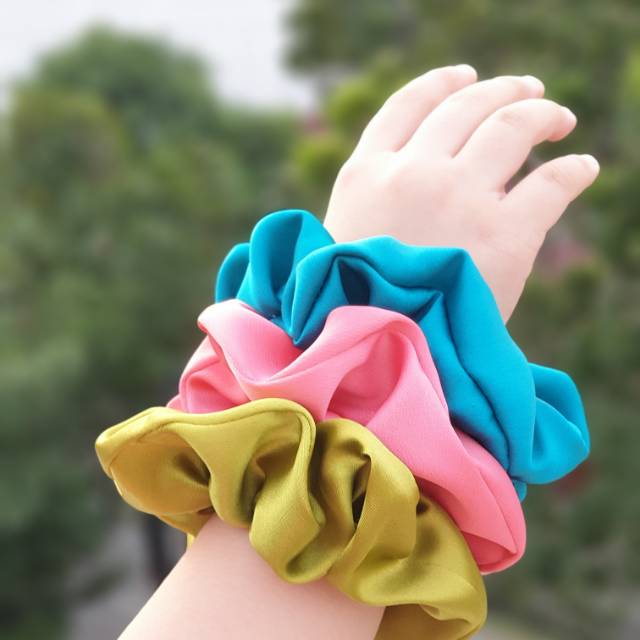 Handmade Scrunchies dengan kain satin dan karet berkualitas yang nyaman dipakai seharian....