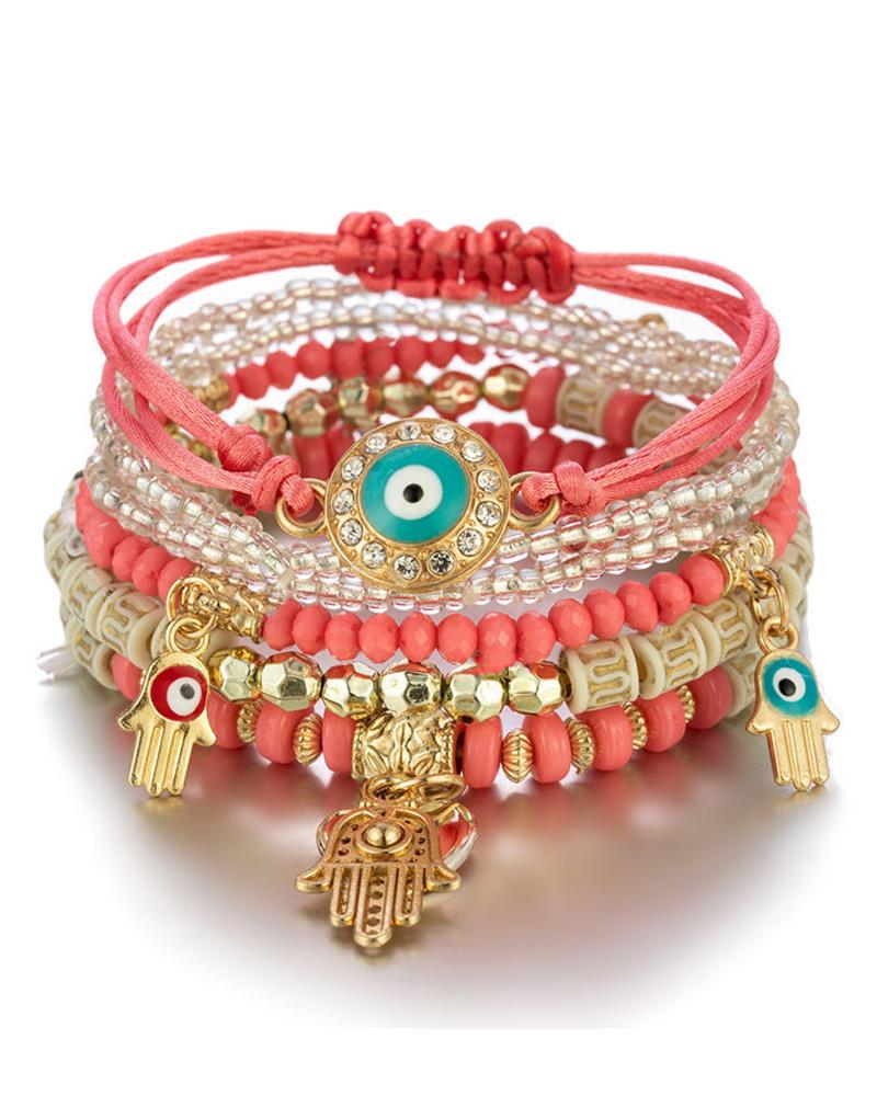 Hands Eyes Pattern Stacking Elastic Beaded Multi-layer Bracelet, Red