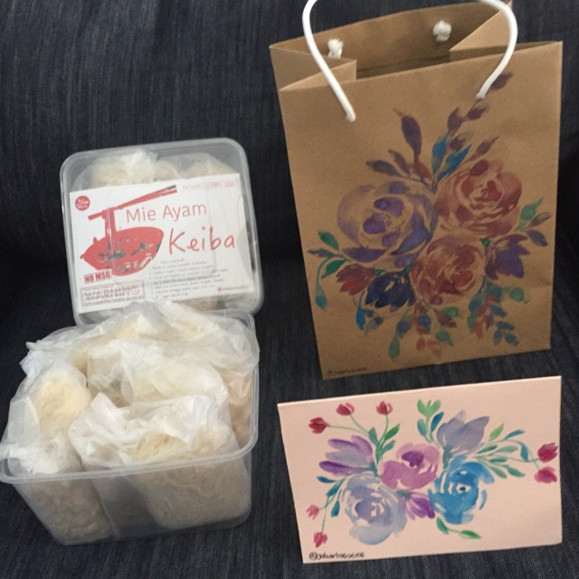 Hantaran Lebaran ini berisi 5 mie ayam kemasan Keiba dengan kantongan dan kartu cantik yang di lukis ( handmade)