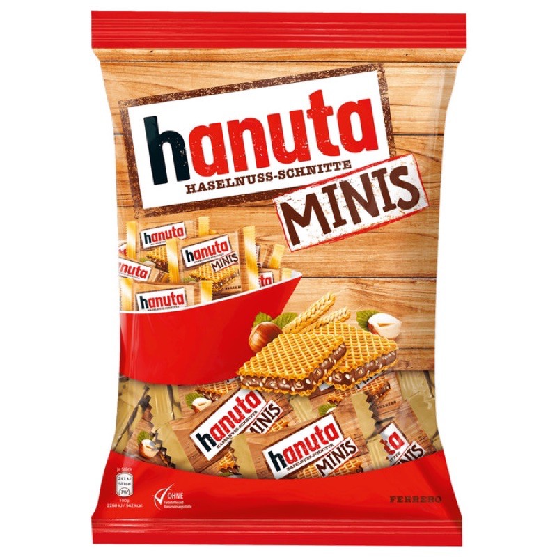 Hanuta is a chocolate and hazelnut crispy wafer presented in a pouch format containing 18 mini, an ideal format easy to carry around and perfect for a little snack.