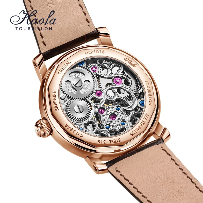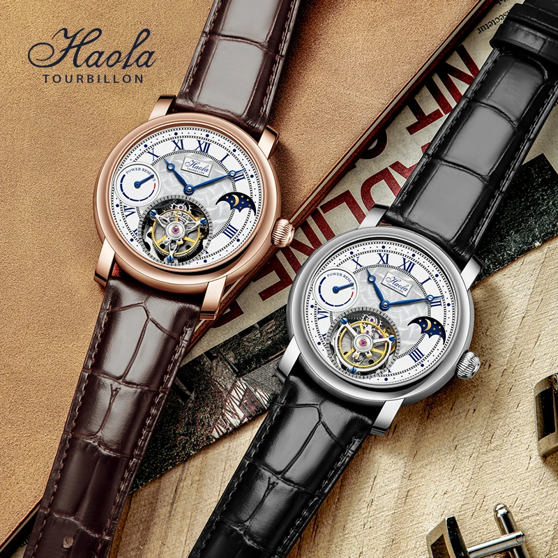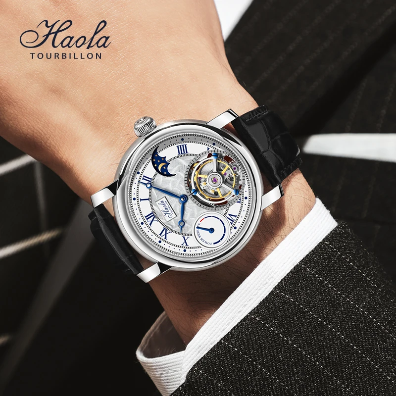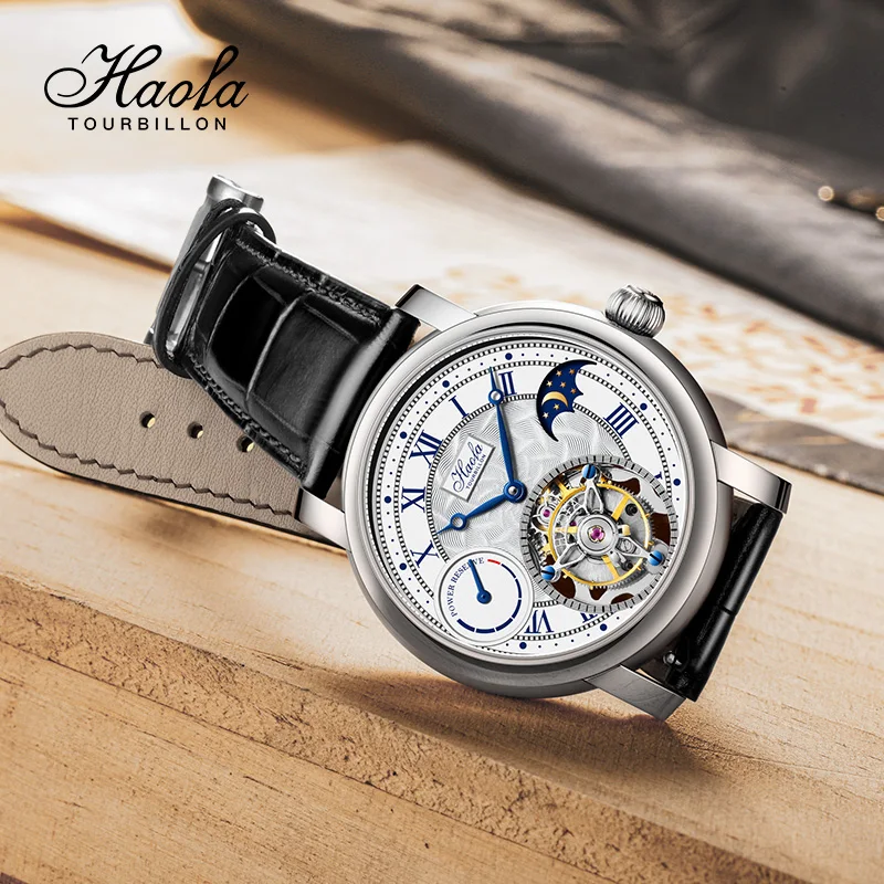 Haofa механические мужские часы с турбийоном и фазой Луны, полые сапфировые механические часы для мужчин, 80-часовой запас хода 1016