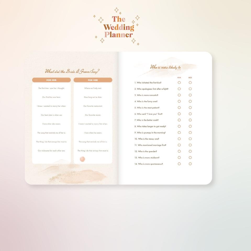 BUDAYAKAN MEMBACA SEBELUM MELAKUKAN PEMBELIAN Paperie Lab - The Wedding Planner The ultimate wedding planner - beautiful, functional, and long-lasting. Keep all your wedding day planning in one place. Key Features: - A5 Size (15x21cm), Hard covered with perfect-bound finishing & rubber band - 2022-2023 Calendar - Interactive Pages - Budgeting - Moodboard & Inspirations - Vendors - Guest Lists - Monthly Planner - Notes - Fast respon jam kerja Senin - Jumat pukul 9.00 - 17.00, Sabtu pukul 9.00 - 14.00, Minggu atau hari libur Off - Mohon mencantumkan warna/gambar/varian pilihan dan cadangannya (jika ada) di kolom pemesanan ya. Jika tidak mencantumkan pilihan, maka akan kami kirimkan sesuai stok yang ready!!! - Pengiriman pada H+1 (malamnya). - Jika barang yang di pesan kosong dan tidak ada respon selama 1x24 jam maka akan di kirim secara random. - Periksa kembali NOMOR HP (TELP) & ALAMAT LENGKAP. Guna mempercepat dan memperlancar pengiriman. - BARANG YANG SUDAH DI BELI TIDAK BISA DI KEMBALIKAN. - Gudang kita ada di DKI Jakarta, Jawa Timur, Jawa Tengah, Jawa Barat dan lainnya. Jadi pengiriman tidak selalu sesuai alamat toko ini yaaa.. >>>> MEMBELI = SETUJU