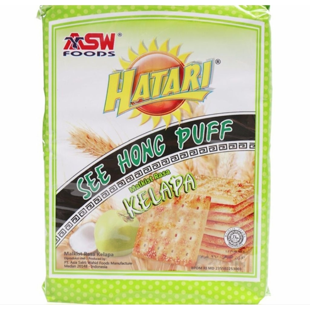 HATARI See Hong Puff Kelapa 245 g merupakan makanan ringan berupa biskuit malkist yang ditaburi dengan gula pasir. Hatari See Hong Puff dikemas plastik seberat 260 gram yang praktis untuk dinikmati kapanpun dan dimanapun. Selain itu, biskuit malkist dari Hatari ini telah dikenal orang masyarakat Indonesia sejak dulu. Dengan rasa yang lezat dan cukup melekat dengan orang Indonesia, membuat merek Hatari lama bertahan dalam persaingan dengan berbagai macam aneka biskuit masa kini. Hatari See Hong Puff nikmat dimakan untuk pengganti sarapan pagi dengan teman tambahan segelas susu atau teh. Perpaduan minuman hangat dan beberapa potong Hatari See Hong Puff dapat menjadikannya hari-hari Anda makin menyenangkan dan ceria.
