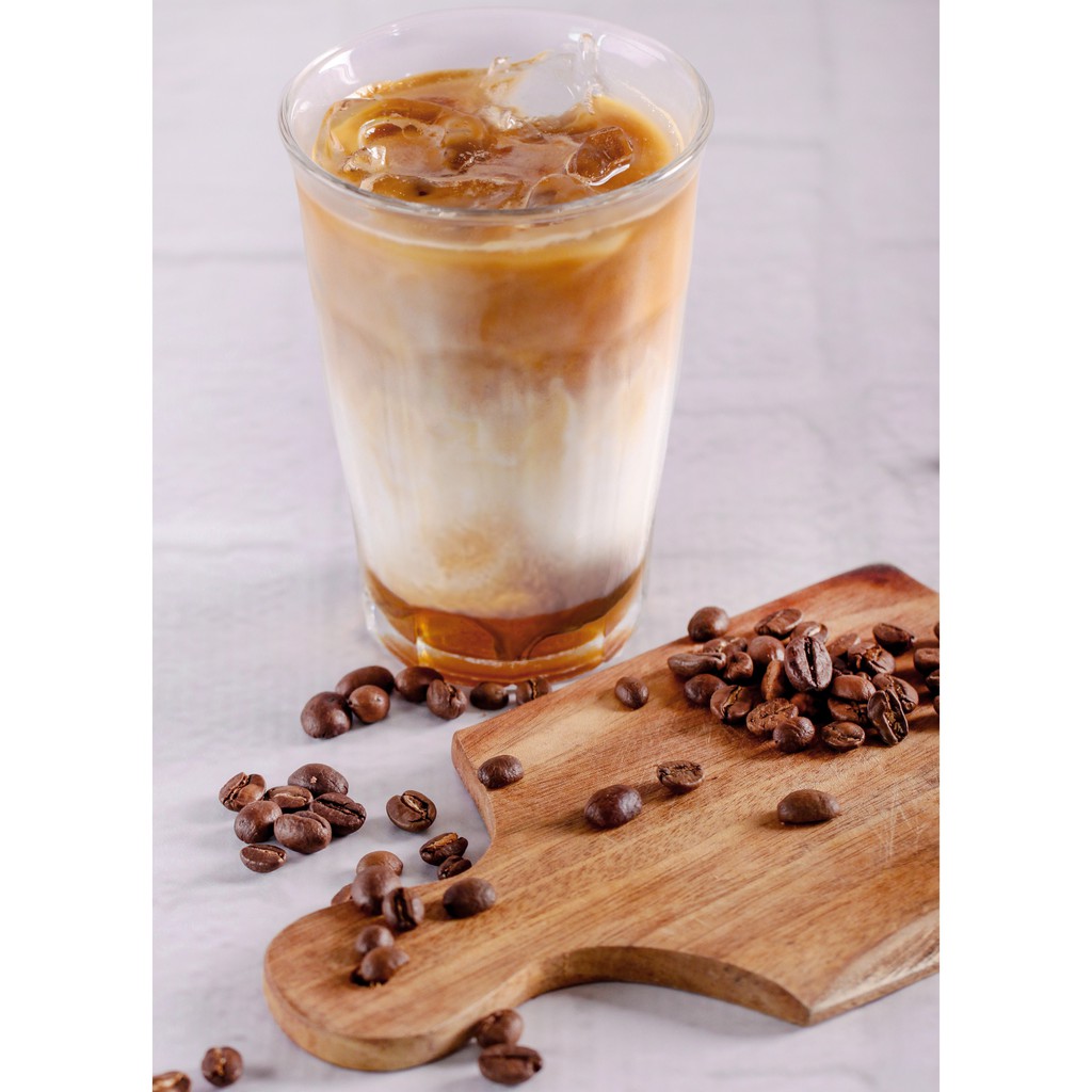 Hazelnut latte dengen fresh milk dan caramel pilihan tanpa pemanis buatan
