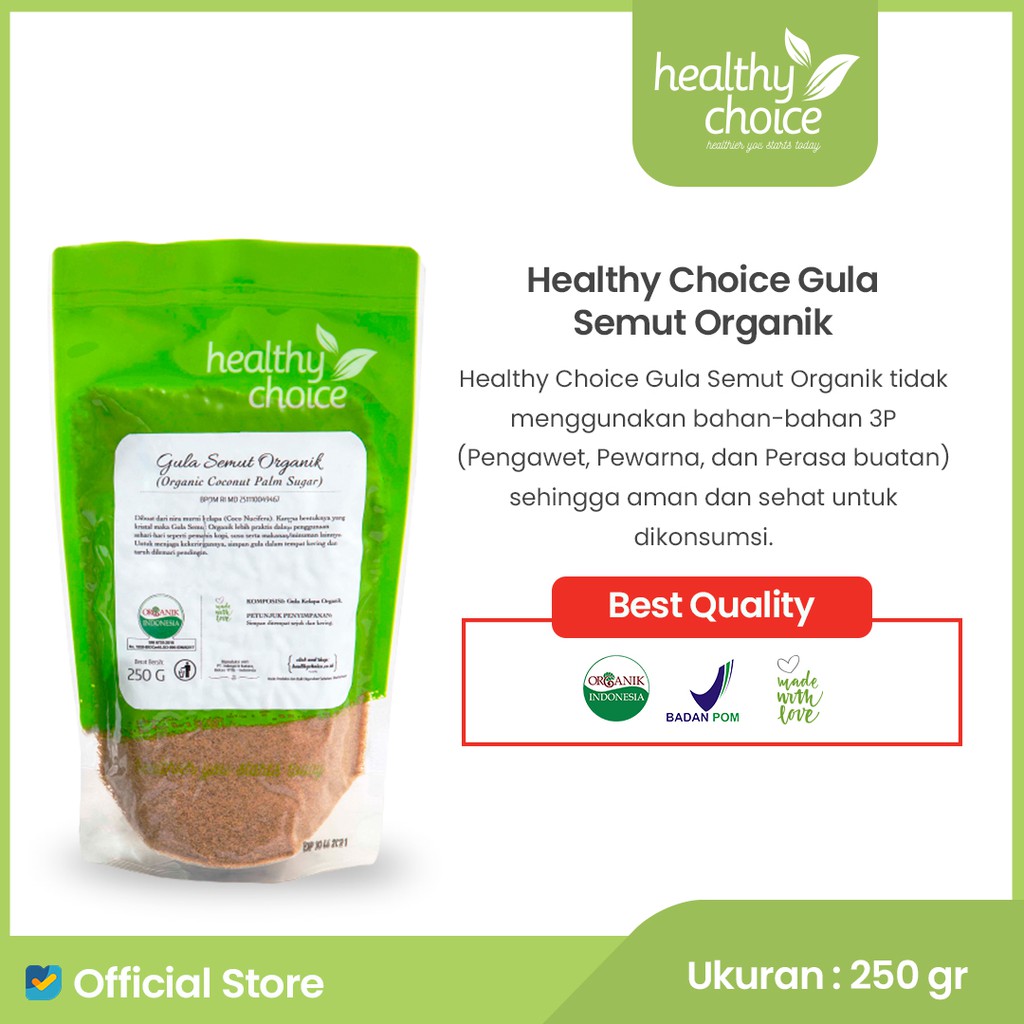 Healthy Choice Gula Semut Organik dibuat dari bahan alami nira kelapa murni (Cocos Nucifera) yang dipanaskan dan kemudian dikristalisasi.