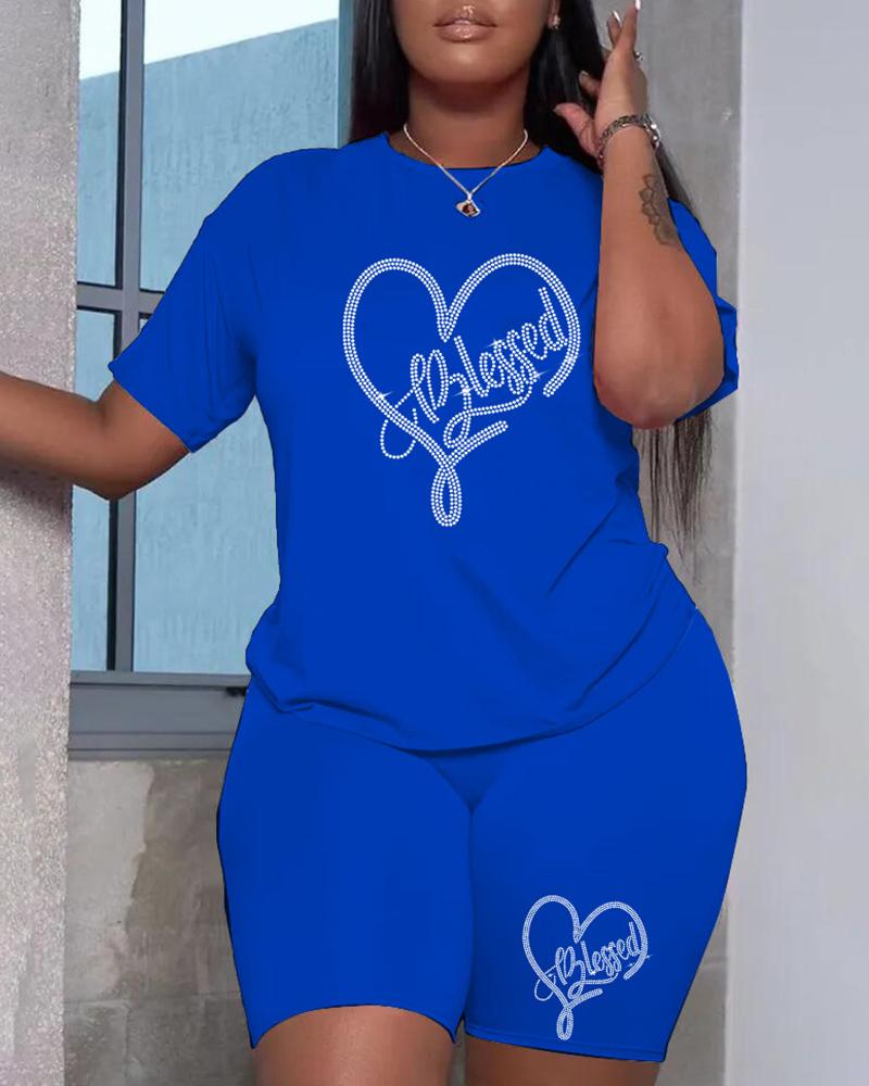 Heart Letter Pattern Rhinestone Top & Shorts Set, Blue