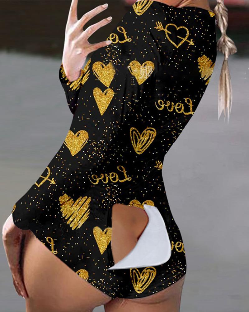Heart Letter Print Long Sleeve Functional Button Design Romper, Black