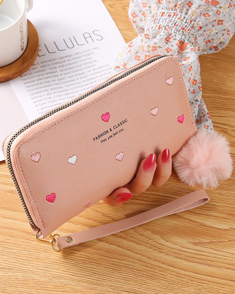 Heart Pattern Pom Pom Zipper Purse, Pink
