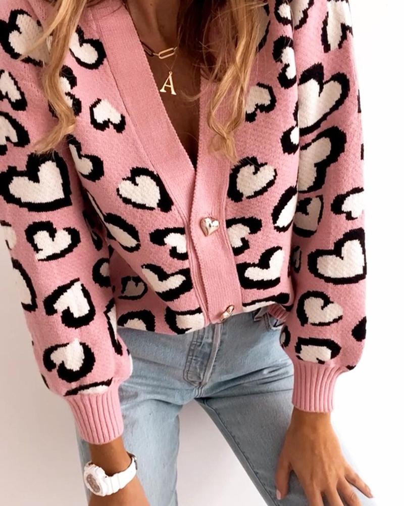 Heart Print Button Front Long Sleeve Cardigan, Pink