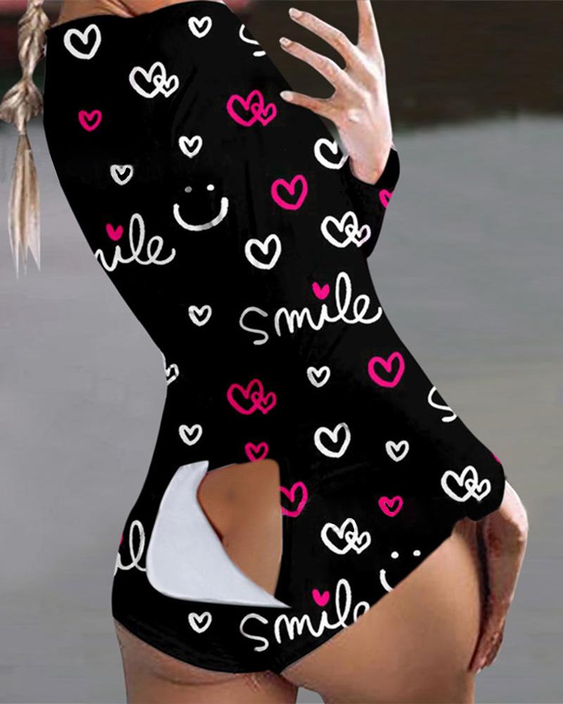 Heart Print Long Sleeve Functional Button Design Romper, Black
