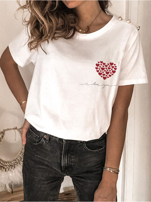 t-shirts,heart print round neck button short sleeve t-shirt