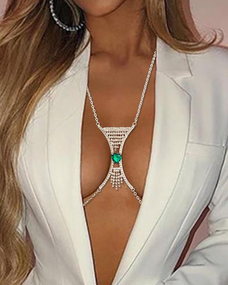 Heart Shaped Rhinestone Tassel Decor Body Chain, Silver