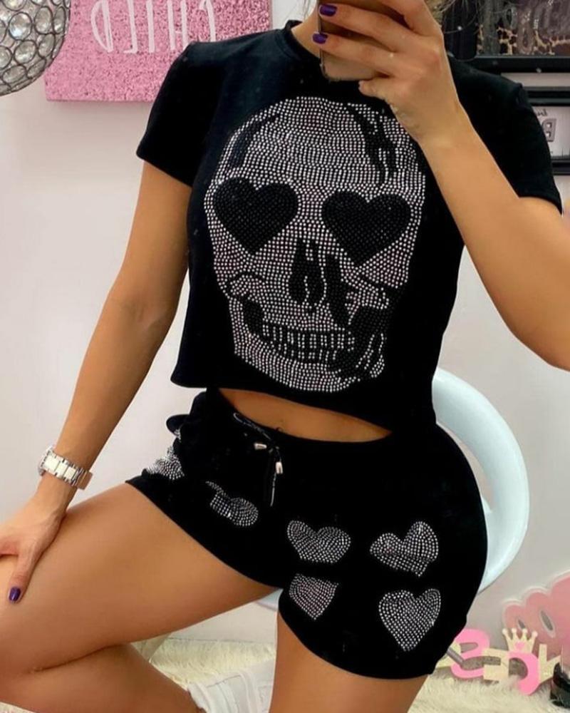 Heart Skull Pattern Rhinestone Top & Shorts Set, Black