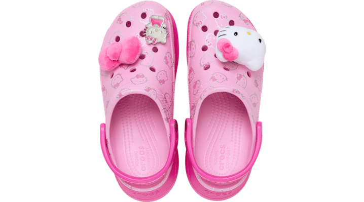 Step up your cute game with Hello Kitty® on the Bae Clog — the ultimate combo of sweet and elevated style. Featuring plush Hello Kitty Jibbitz™ charms, soft pink tones, and an all-over character print, this height-boosted silhouette brings bold energy to every step. With extra cushioning, a chunky platform, and serious charm, it’s a look that says adorable — with attitude. Hello Kitty Bae Clog Details: All-over Hello Kitty print on upper Exclusive plush Jibbitz™ charms inspired by Hello Kitty Unique 2.4-inch / 60mm height, measured from floor to heel rest Textured details around the heel, toe box and collar Customizable with Jibbitz™ charms Iconic Crocs Comfort™: Lightweight. Flexible. 360-degree comfort.