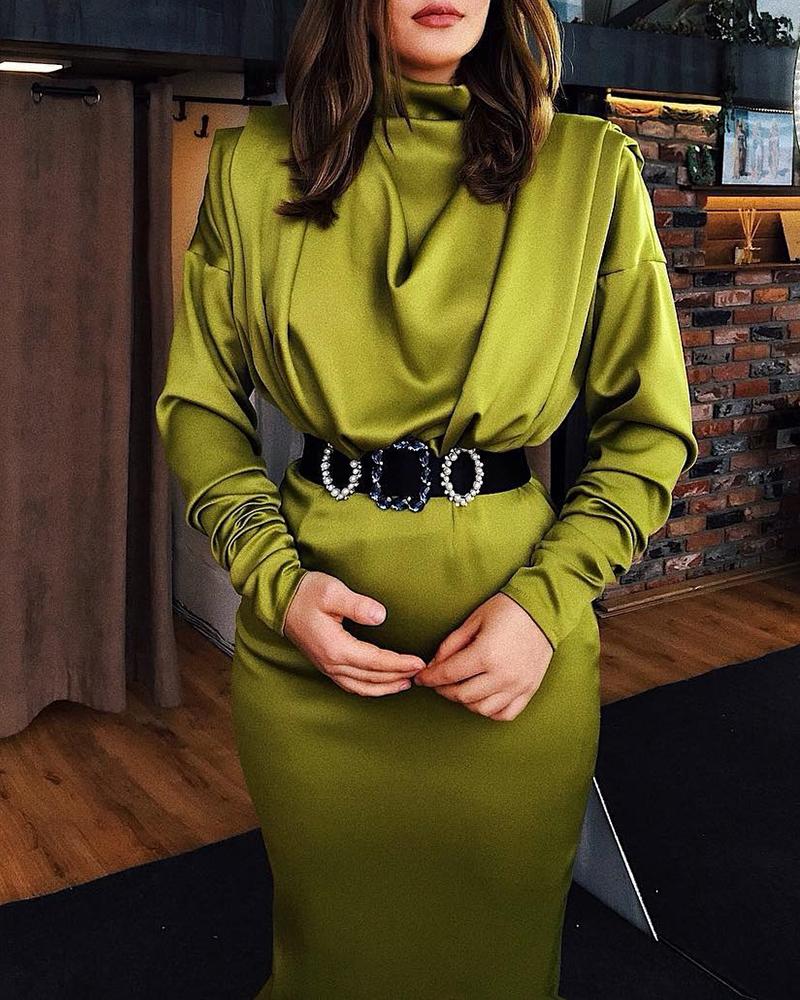 High Neck Drape Front Ruched Long Sleeve Dress