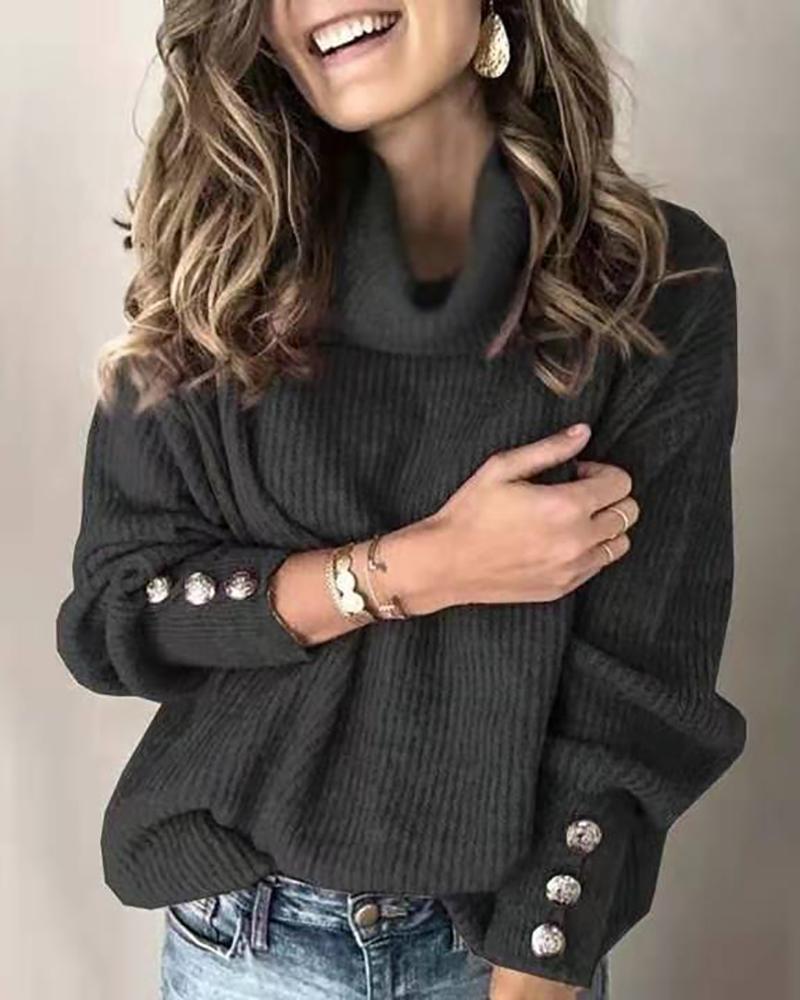 High Neck Lantern Sleeve Buttoned Ribbed Top, Black