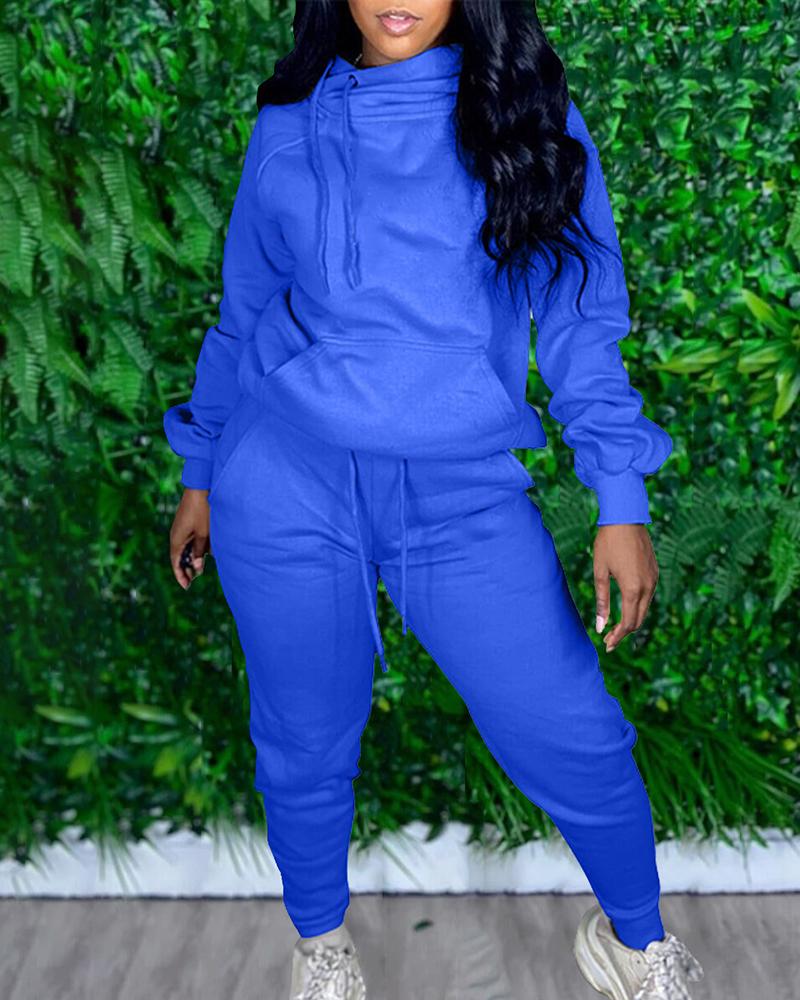 High Neck Pocket Design Sweatshirt & Drawstring Pants Set, Blue