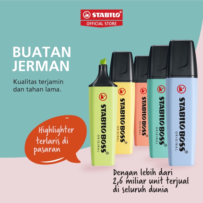 STABILO BOSS Original dilengkapi teknologi Anti-Dry-Out, produk tidak kering walau dibiarkan terbuka tanpa penutup selama 4 jam. Sehingga pada waktu belajar tidak usah repot membuka-tutup highlighter-mu