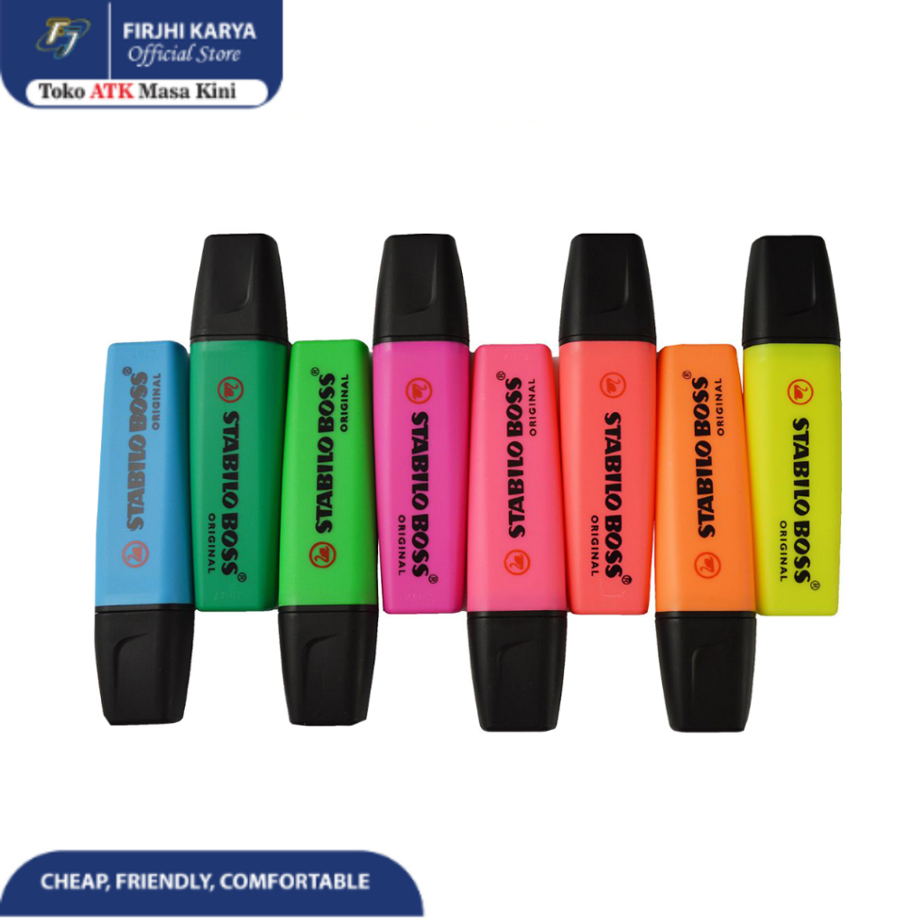 Highliter Stabilo Boss Original Kegunaan sebagai Penanda berwarna, Untuk Menandai Hal yang penting dengan Perlindungan tahan kering untuk pekerjaan terkonsentrasi dan Penghematan sumber daya produk menggunakan bahan daur ulang.