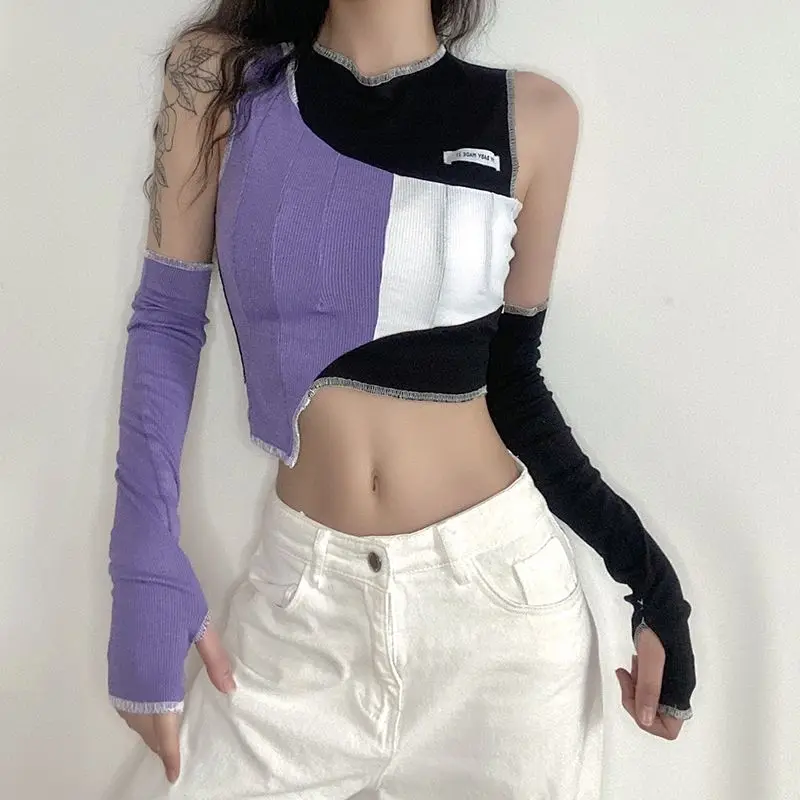 Hikigawa шикарные модные женские Y2k Асимметричные облегающие сексуальные футболки из двух частей без рукавов уличная одежда Лоскутные нарукавники женский топ