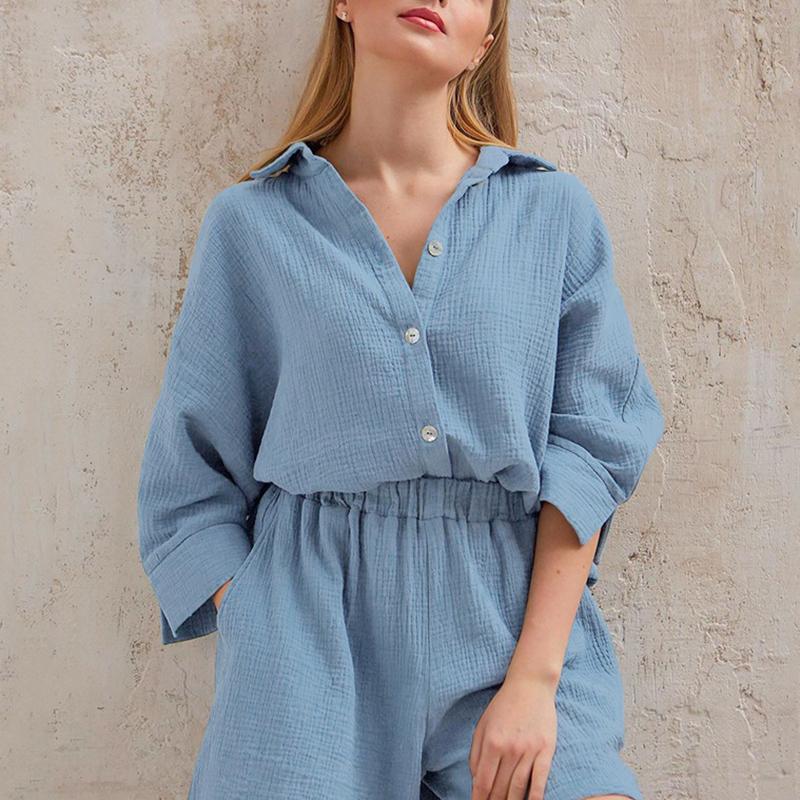 Hirsionsan, летняя свободная рубашка с короткими рукавами и эластичные шорты, женские однотонные повседневные хлопковые костюмы из двух предметов, женский пригородный костюм S светло-синий