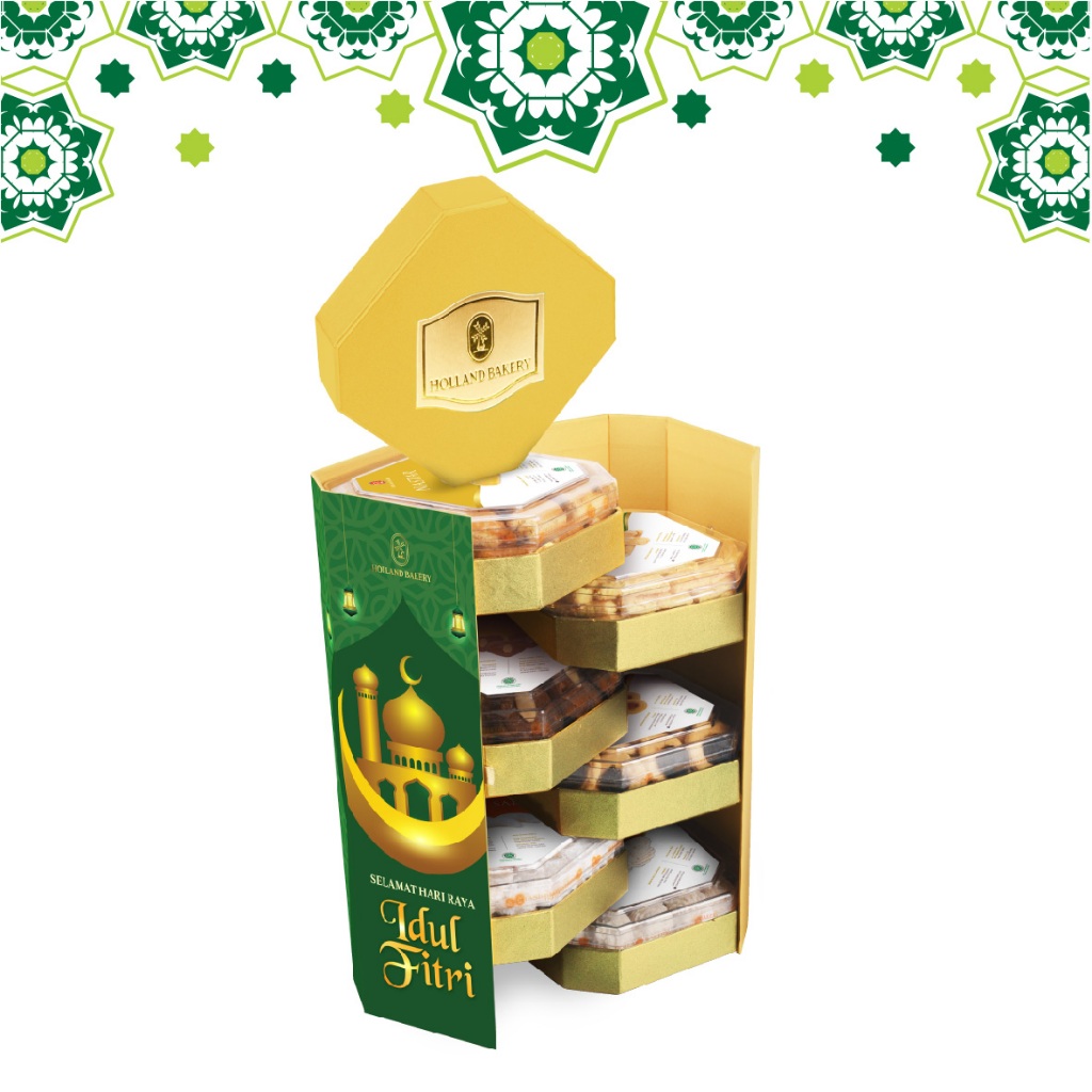 Bingkisan Lebaran dengan desain yang menarik berisi 6 macam pilihan kue kering toples segi 8. Terdapat variant Nastar, Kaasstengels, dan 4 toples pilihan kue kering lainnya.