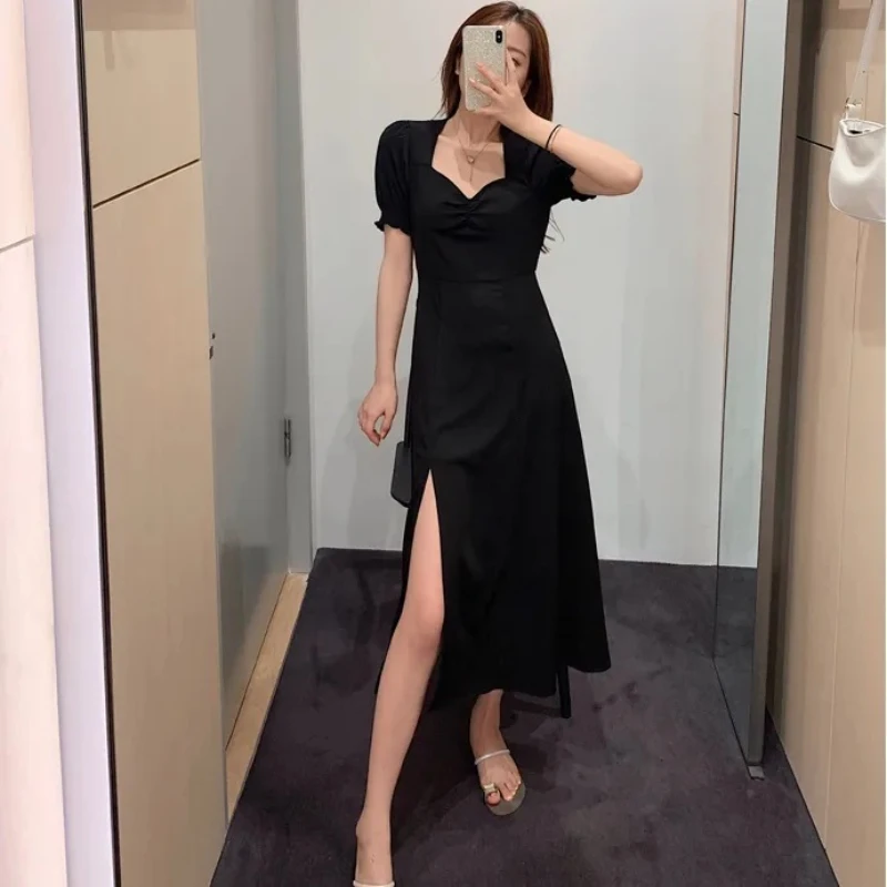 2022 Fashion Summer Bubble Short-sleeved Dress Female Retro Hollow Sexy Square Neck Bohemian Dress Medium-length Dress