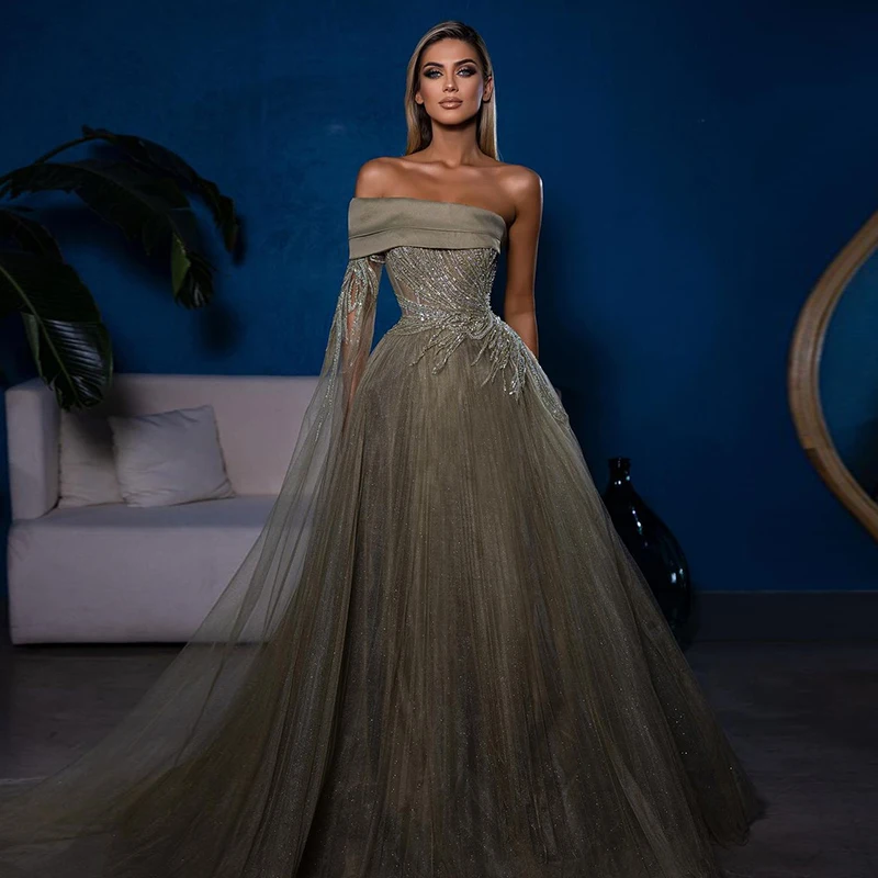 Honeyed оливковое ТРАПЕЦИЕВИДНОЕ зеленое роскошное вечернее платье Дубая с одним рукавом с бисером арабские женские строгие платья для свадьб...