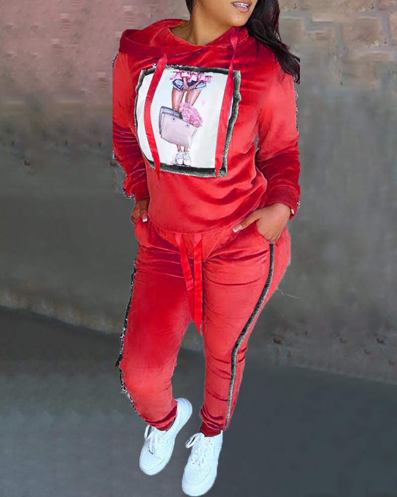 Hooded Drawstring Figure Pattern Sweatshirt & Pants Sets, Red