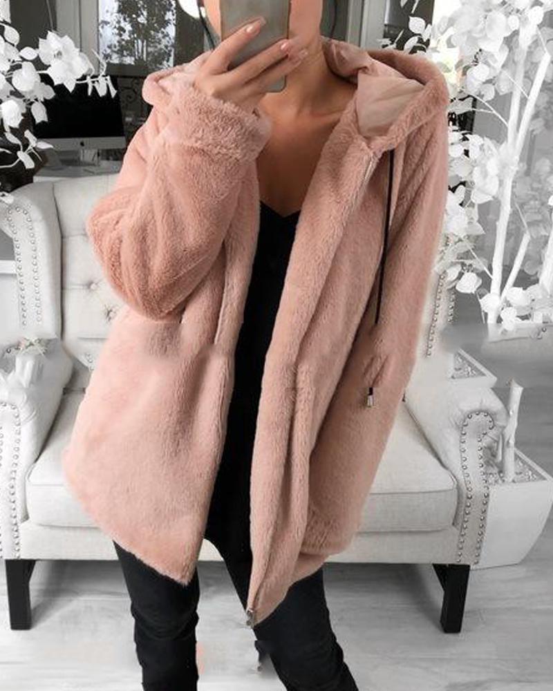 Hooded Zip Front Fluffy Jacket