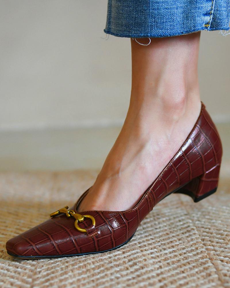 Horsebit Decor Croc Embossed Chunky Heels, Brown
